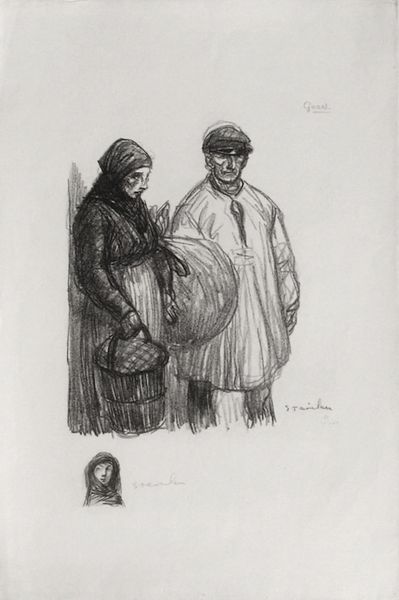 Curator: What a somber scene. There's a stark vulnerability that's palpable. Editor: Agreed. Steinlen's 1916 pencil drawing, "C’est ici, chez nous!" confronts us directly with the human cost of war. The title translates to "It is here, at our home!" adding a layer of painful irony. Curator: Look at how the figures dominate the foreground, particularly the mother. It is very powerful commentary when we examine Steinlen’s dedication to representing working-class life throughout his career. Editor: Absolutely. Consider the historical context too. This was created during World War I, and it serves as an important social document. The devastation in the background, the damaged buildings, they bear witness to what 'home' had become for so many families. The romantic style doesn’t romanticize war; rather, it draws on shared human empathy. Curator: Exactly. I notice the ruins sketched out rather than highly defined and the same with the figures traveling to the right. It isn't about individual heroism but a collective experience, of loss and displacement of entire families. What does this evoke for you? Editor: I'm drawn to their expressions; their resignation mixed with a fierce determination is gripping. It challenges dominant war narratives by shifting focus to those most affected by conflict. Steinlen isn't just depicting a scene; he’s capturing the complex emotional reality. I’m also interested in his choice to make a work on paper with a relatively 'simple' medium. Curator: And this stark medium emphasizes the rawness of the experience, avoiding any sense of grandiosity often associated with war imagery. It's an appeal for compassion and an implicit critique of the systems that caused this suffering. It certainly impacted how imagery from future conflicts would circulate and the social commentary such images made. Editor: Yes, it highlights art’s function as a historical record that encourages critical awareness and dialogue regarding issues of power, identity, and resilience amid destruction. It’s a reminder of the continued impact of war on individuals, families, and communities. Curator: Indeed, Steinlen gives us more than just an image, but a testimony, allowing the present-day to question and reflect. Editor: Exactly.