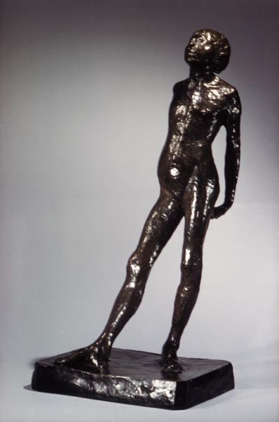 Editor: So, this is Degas’ "Spanish Dancer (First State)," a bronze sculpture he worked on between 1879 and 1920. The texture of the bronze seems so rough and unrefined, yet it captures such a fluid sense of movement. What’s your interpretation of this piece? Curator: Well, beyond its obvious beauty, this sculpture invites us to think critically about representation. Degas often depicted dancers, and it’s crucial to analyze these works within the context of 19th-century French society and its colonial gaze. How might the portrayal of a “Spanish Dancer,” filtered through a French, male artist's perspective, reflect and perpetuate certain stereotypes or power dynamics? Editor: That's a really interesting point! I hadn't considered that. I was just focused on the dancer's pose and the impressionistic style, which I thought was unusual for a sculpture. Curator: Exactly, and it's that tension – between the apparent celebration of movement and the potential exoticization of the subject – that makes it compelling. Who do you think had access to, or might have been the primary audience of, works such as this during the height of French Imperialism? And what did these images reinforce? Editor: Probably upper-class patrons? And it probably reinforced a sense of French cultural superiority, viewing other cultures as...exotic spectacles. Curator: Precisely. By looking closely at the ways identity and culture are presented, we can use Degas's sculpture to have discussions about orientalism, cultural appropriation, and the lasting effects of colonialism. Editor: I guess it is a lot more complicated than just a pretty sculpture. Curator: Yes, but that complexity is where the real learning begins. What was your experience viewing the sculpture in that light? Editor: It’s definitely given me a lot to think about. It shows how important it is to consider the socio-historical context of artwork.