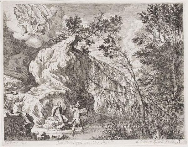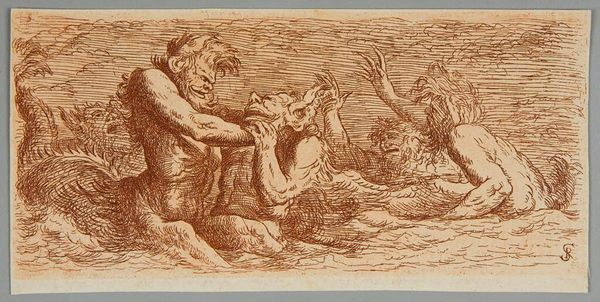 Curator: Here we have Claude Lorrain's "Child Entrusted to Chiron," a drawing of modest dimensions, roughly nine by five inches. Editor: It feels both dreamy and unsettling. The sepia tones give it an antique quality, like a faded memory. Curator: Lorrain, active in 17th century Rome, often explored classical mythology, but through the lens of landscape. The red chalk allowed for fine detail but also rapid execution. Editor: I love the idea of quickly capturing this kind of scene! I’m mostly struck by the implied vulnerability of the child being handed off. The figures aren't exactly joyful. Curator: We should consider the social context of artistic training. The handing off of children reflects systems of patronage, labor and skill development, perhaps commenting on apprenticeship, or even class structure. Editor: I see that, but it also evokes a timeless feeling of parental anxiety. I can’t help but feel the quiet drama between the figures. Curator: These drawings offer insight into the artistic process and the structures that supported it. Editor: And I think they remind us how universal some feelings really are.
