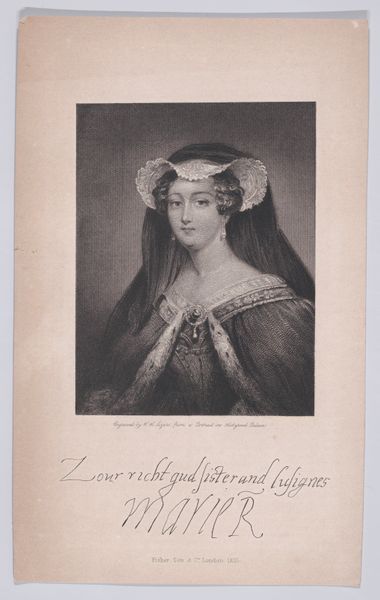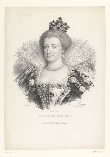 Curator: We’re looking at a drawing by Zéphirin Belliard from 1832, titled "Portret van Henriëtta Maria van Frankrijk, koningin van Engeland, Schotland en Ierland." It appears to be primarily executed in pencil. Editor: Hmm, my first thought? Regal sadness. The shading around her eyes makes her look a bit melancholic, despite all the royal bling. It is giving Romantic Era vibes, even with its rigid composition. Curator: The materiality supports your reading. Look closely at the pencil work – Belliard's delicate strokes seem intended to capture not just likeness but also the perceived "feminine" sensibility of Queen Henrietta Maria as the romantic ideal, within the context of early 19th-century portraiture. The mass production of printed portraits made them more accessible for a burgeoning middle class. Editor: Right, and the romantic element ties into that fascination with feeling, emotion and nostalgia. There’s something hauntingly beautiful about how ephemeral pencil can be, like it could smudge away at any moment and with it, the last trace of this queen who lived centuries before. Curator: Considering the materials, it’s also relevant how printmaking facilitated the dissemination of royal imagery but also democratized access to art. Think about the economics of representation here—pencil drawings like this could serve as models for engravings, expanding their reach. Also it is an industrial copy, how can that be? Editor: Exactly! It's not just about documenting royalty; it is also about replicating it for consumption. Looking closer, it seems that we can talk about it only as a sketch since it is very delicate in details, maybe made as the initial draft to be more realistic and rigid. Curator: And with Romanticism in mind, there’s a definite engagement with "realism," yet with idealized features that still speaks volumes. It’s a delicate balance. Editor: Yes. You know, looking at it again, it really does evoke that era of powdered wigs and political intrigue… plus a healthy dose of dramatic emotion thrown in. That sense of impermanence I mentioned is, if you consider her place in history, quite poignant. It feels both grand and incredibly personal. Curator: Ultimately it offers insights into the cultural value placed on female representation during that historical juncture, along with questions about consumption and labor, as copies proliferate and saturate social classes. A good, succinct peek into history right here.