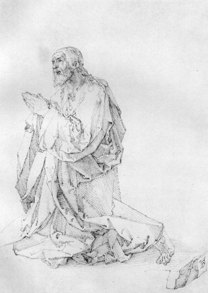 Alan Lee's drawing, "Merlin Dreams," employs graphite to conjure a figure steeped in slumber and mystery. The composition is dominated by densely worked lines, creating a tactile, almost overwhelming texture. Note how Lee uses the medium's tonal range to produce a sense of depth and enclosure. The lines mimic organic forms—hair, beard, stone—blurring the distinction between the figure and the natural world surrounding him. This blending evokes a sense of unity, where Merlin is not merely resting, but intertwined with the very fabric of the landscape. The piece destabilizes traditional portraiture through its emphasis on texture and form over distinct representation. Merlin's closed eyes and the heavy shading suggest a movement away from external reality and into an inner, perhaps mystical, space. Ultimately, Lee's focus on materiality invites us to consider the drawing not just as an image, but as an object whose formal qualities underscore the themes of immersion, transformation, and the porous boundary between consciousness and the environment. The drawing's power lies in its ability to make us feel the weight and density of Merlin's dream.