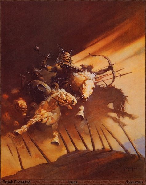 Frank Frazetta made this dramatic painting, *Death Dealer 6,* in his signature style. It is reminiscent of pulp magazine covers of the mid-20th century. Frazetta’s work captivated audiences with its hyper-masculine figures and fantastical themes. The Death Dealer, a recurring character in Frazetta's oeuvre, embodies a raw, visceral power. Perched atop a muscular steed, he holds a menacing axe as he confronts a giant serpent. The figure is imposing. The vibrant colors and dynamic composition intensify the scene, drawing viewers into a world of primal conflict. Yet, these images often present a simplistic vision of power. Frazetta once noted, "I like the savage in things." This fascination can overshadow more nuanced explorations of identity and power. It speaks to a longing for a more brutal, less complicated world. The work encourages us to consider the narratives we construct around masculinity, and how art both reflects and perpetuates such ideals.