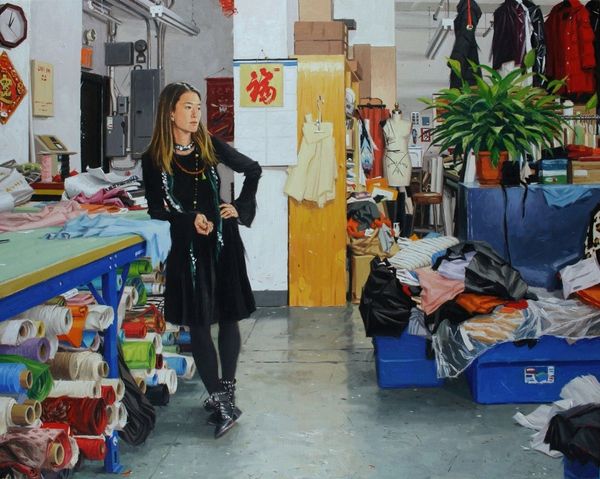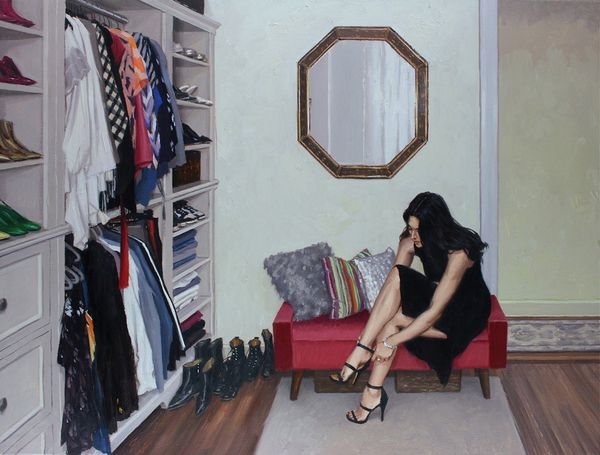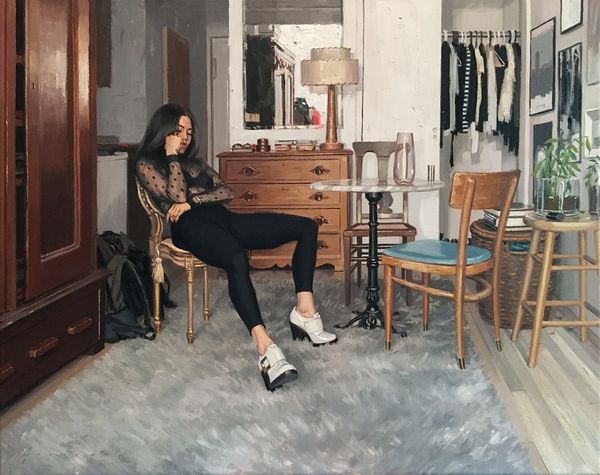 Vincent Giarrano, born in 1960, painted "Aureta Packing at the Empire," a scene dominated by a rich, cobalt blue wall that immediately sets a contemplative mood. The composition is structured around contrasts: the cool, deep blues versus the warm, patterned textures of the room's furnishings. Giarrano uses the room's objects to frame Aureta, drawing our eye to her central figure. The mirror on the left creates a doubling effect, hinting at themes of reflection and identity. The light source, seemingly from the right, casts shadows that add depth, emphasizing the materiality of the scene. Through the deliberate arrangement of objects, Giarrano creates a visual narrative open to interpretation, inviting us to consider the interplay between personal space, identity, and the quiet moments of preparation. Each viewing offers a new perspective, a fresh dialogue between the artwork and its observer.