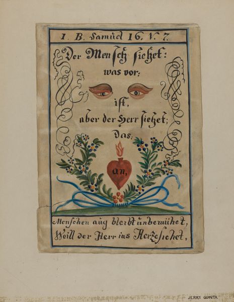 Editor: We’re looking at a “Pa. German Birth Certificate,” likely from around 1936, rendered in watercolor on paper. It's quite small, almost like a miniature painting. The folk-art style makes me think of a hand-made card, perhaps for a special baby. What catches your eye in this piece? Curator: It’s fascinating to consider these Fraktur documents, like this birth certificate, within the larger context of early American cultural expression. The Pennsylvania Germans, also known as the Pennsylvania Dutch, were seeking religious freedom in a new land, and they brought with them artistic traditions that then adapted to new social conditions. The very act of creating these elaborate certificates served a public role, affirming identity and community ties. Editor: So it's not just a family heirloom, but a social document as well? Curator: Exactly. Think about it: Literacy, record-keeping – these weren’t necessarily givens for everyone in this society. These Fraktur served as visual testaments, solidifying belonging. The vibrant imagery – those stylized tulips, for instance – they aren’t just decorative; they signal a distinct cultural heritage. What political undercurrents can you detect in choosing certain patterns, motifs, and in preserving these communal ways in America? Editor: I hadn’t considered the act of creation itself as a statement of identity and cultural preservation, almost like a quiet act of resistance in a new world. It adds another layer to my interpretation. Curator: Indeed. This humble piece of folk art becomes a lens through which we view early American social history. The museum amplifies its meaning by presenting this intimate artifact as part of the larger cultural narrative. Editor: I learned a lot looking at this seemingly small work of art; I am inspired to think more critically about how museums give common items political resonance. Thank you!