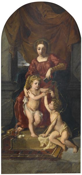 Editor: This is Paolo Veronese’s “Venus and Amor,” painted around 1575. It's an oil painting. I find it interesting how casually sensual it feels, and was struck by how domestic she looks rather than goddess-like. What strikes you when you look at this, professor? Curator: Well, "casual" is an interesting choice, isn't it? There’s a vulnerability, sure, a sort of "caught in the moment" intimacy that Veronese excels at. But think about the layering, the theatrical fabric… and Amor, clutching at her. Is it love, desire, something… possessive? For me, it is less 'casual' and more of an intimate, yet very loaded glance. It’s not a devotional image; it's almost... confrontational. Editor: Confrontational how? Is it about the power dynamic between Venus and Amor? Curator: Exactly. Think about the time period! The Renaissance grappling with classicism but reinterpreting it through a contemporary lens. He paints the "goddess", the ideal form of feminine beauty, with blemishes like wrinkles. But it's her *gaze*, unflinching, almost challenging *us* - are we worthy of witnessing such raw emotion? It plays into the Mannerist sensibilities, wouldn’t you agree? That artistic tension... it's irresistible. Editor: So it's this dance between vulnerability and power that really makes the piece resonate? And this gaze feels more forward compared to the idealised paintings I'm used to! Curator: Absolutely. This tension. Think of art like a story. It never gives you all the answers. That discomfort… the "what happens next?" feeling – that’s what keeps us looking. Makes you think about desire. It doesn’t flatter, it questions. And art, real art, must question to stay alive. Editor: I never really considered art could *question*. I am viewing "Venus and Amor" differently already. Thanks. Curator: Always look beyond the pretty surface and find its own question. And that will keep any piece with you forever.
