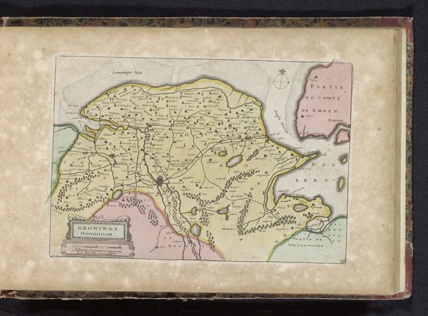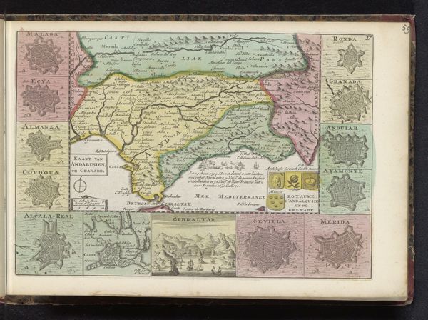 Curator: What immediately grabs me about this work is the intricacy. So much labor must have been required. Editor: Indeed. Let’s delve in. We're looking at an etched and engraved print titled "Kaart van de meierij van 's-Hertogenbosch," meaning a map of the Bailiwick of 's-Hertogenbosch. It's attributed to an anonymous artist and dates roughly to between 1700 and 1735. Curator: It's more than just geography, though, isn't it? See how they’ve coloured some of the areas? It speaks of ownership, control…the raw materials and where they are situated are clearly of importance. Editor: Precisely. These cartographic works served a political function, defining territories and legitimizing claims. Notice the clear delineation between "Partie de Hollande" and other regions; borders marked not only with lines but different colours entirely. The imagery also indicates control by certain cities, showcasing centres of power and trade. Curator: The type of paper would be interesting to examine, its availability, origin… this affected its price. The creation of multiple prints like this surely factored into the economy and how this Bailiwick was regarded by others? It served a function, informing the trade routes for goods being imported and exported across that area. Editor: Absolutely. The distribution networks are important to consider. Were these maps readily available to the public, or were they primarily for the use of the political elite and merchants? Consider also, the institutional aspect – perhaps they were displayed in municipal buildings or used in schools. It speaks to power dynamics, access to information, who was 'in the know’ at this time. Curator: I see your point entirely. If you look closely at how the topography is presented through that detailed process of etching and engraving—that texture gives a sense of not just geographical but economical…possibilities, perhaps? The very act of portraying the landscape transforms the resources into potential value and highlights accessibility, a key thing when thinking of distribution. Editor: In essence, a two-dimensional representation reflecting complex societal realities, right down to distribution methods. Thank you for providing those essential connections. Curator: My pleasure! It all returns to how it’s made and distributed—both of which provide us clues for the reasons as to *why* it was made in the first place.
