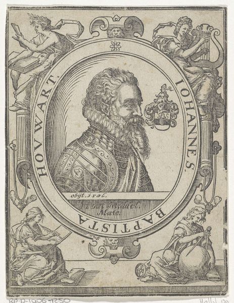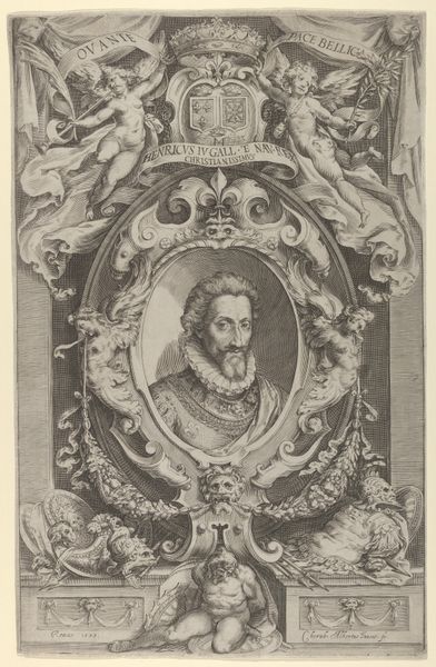 Editor: Here we have "Portrait of Pietro Angela da Barga," a striking engraving done sometime between 1570 and 1615 by Cherubino Alberti. I am immediately struck by the solemn, almost severe expression on Pietro's face, contrasting with the almost playful cherubic figures flanking him. How do you interpret this tension? Curator: That tension, as you call it, speaks volumes. Look at the laurel wreath. What do we know about laurel wreaths? Who gets to wear one? We need to place Alberti’s work into the social fabric of its time. Editor: Wreaths usually signify some kind of achievement, maybe intellectual or military prowess... Curator: Precisely. Consider that Pietro is framed—literally and figuratively—by ideals of Renaissance humanism, represented by the book held by cherubs which suggests education, and by that rigid frame! This creates an intellectual landscape; it almost weaponizes the very act of portraiture. Who gets remembered? What biases are at play in selecting historical figures for such glorification, and why? Editor: So, you are saying that by immortalizing Pietro this way, Alberti is making a very deliberate statement about who is deemed worthy of remembrance and recognition? Curator: Exactly! Art is never created in a vacuum, and this image becomes a document reflecting the complex intersection of power, privilege, and artistic intention in early modern Italy. The fur around Pietro’s shoulders is another signifier. Where do those expensive items come from? Whose labor made them? Those are pertinent, and difficult, questions, Editor: I never thought of portraiture as having such social weight. I guess I saw the artistry, but missed the politics of it. Curator: Art opens us to new ways of thinking, if we're brave enough to push our thinking. That’s why interdisciplinary perspectives are invaluable, helping us unpack the subtle yet powerful statements embedded within seemingly simple artworks.