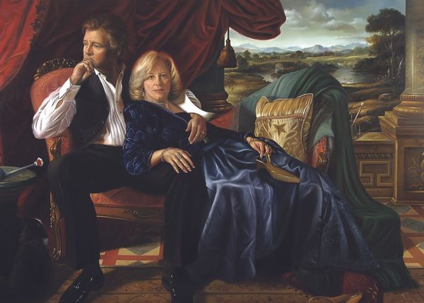 Curator: Nelson Shanks' 1996 oil painting, "Arianna and Michael Huffington," offers a compelling study in portraiture. Editor: Right off the bat, it feels very…posed. Staged, even. Like everyone took a collective breath and tried to look important. But there’s something appealing about the formality, almost like a throwback to earlier eras. Curator: Formally, it’s fascinating. Note the meticulous attention to detail. Shanks renders texture beautifully—the sheen of Michael's suit, the intricate folds of Arianna's skirt, even the plushness of the pillows. The composition is carefully structured, creating a balanced yet dynamic visual field. Editor: That balance is interesting, especially with how he's looming, almost rigidly, beside her. She seems far more relaxed, sunk into the cushions with books nearby. There’s a real contrast, right? Her softness against his almost architectural…firmness. Curator: Precisely. And consider the use of the mirror in the background. It not only adds depth but also refracts our perception, hinting at hidden facets of their personalities. The easel, slightly out of focus, perhaps gestures to Shanks' own artistic presence and the constructed nature of the image. Editor: You know, I initially saw it as a reflection of their public personas, the layers they present to the world. But you are right; it hints more at the artist's touch, almost inviting him to reflect with his view of the Huffingtons. It really gives more context of their environment. Curator: The color palette also deserves attention. The muted tones, punctuated by Arianna’s red hair, create a sense of subdued elegance. Shanks uses light and shadow masterfully to sculpt form and evoke a particular mood, wouldn’t you agree? Editor: Agreed. I’m finding that formality more interesting, especially since there are objects and personal elements placed within this portrait to invite you to question. They almost tease a larger story beneath. It isn't simply a stiff depiction. Curator: Exactly. Shanks challenges us to move past surface appearances. The visual organization allows you to come up with different interpretations, but invites you into conversation about these figures as social players. Editor: I can see that now. It's less a portrait of individuals and more a carefully arranged display of roles and relationships. Almost like looking at players on a chessboard. Curator: Indeed. It leaves us contemplating the dynamics of power, representation, and the artist's own role in shaping our perceptions. Editor: I came into this thinking one thing and am definitely leaving with another. That tension makes the work far more interesting to consider. Thanks for revealing more, I really appreciated the deep dive into the construction and meaning.
