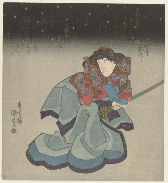 Utagawa Kunisada created this woodblock print, "Man with Sword at Night," in 19th-century Japan, a time of great social and political change. This image showcases a figure, likely a samurai or kabuki actor, caught in a moment of intense action. Woodblock prints like this one weren't just art; they were a popular form of media. They circulated widely among the merchant classes and the burgeoning urban centers of the Edo period. Kunisada’s work reflects the tastes and interests of this audience. The figure's dramatic pose and fierce expression would have resonated with viewers familiar with kabuki theater. But it also speaks to the broader social anxieties of the time. As Japan navigated internal power struggles and external pressures from the West, images of strong, assertive figures held particular appeal. To fully appreciate Kunisada’s art, we must consider the culture that produced and consumed it. By researching the history of kabuki theater, the socio-political context of 19th-century Japan, and the development of woodblock printing as a commercial enterprise, we can gain deeper insights into this fascinating work.