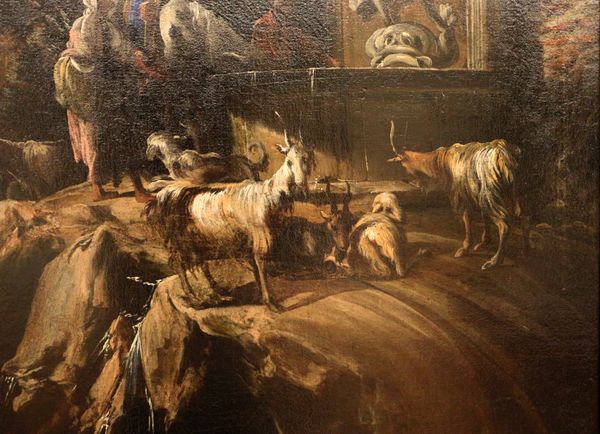 Editor: We’re looking at “Aggravation,” an oil painting by Briton Riviere, created in 1896. The immediate impression I get is chaos—a pack of dogs barking up at someone dressed as a jester looking over a wall. What's your read of this work? Curator: Ah, chaos tamed, perhaps? Or is it? Riviere, you know, was quite the animal painter. This one makes me chuckle. Look at that jester, perched up there like a naughty imp, pointing down as if he's personally offended these pooches! He's certainly stirring things up. What a wonderfully painted frenzy of teeth and fur, all that animalistic energy directed upwards, quite contained actually, by the wall. Editor: Contained, yes, but also quite agitated! I find it interesting that he painted dogs so often, were dogs a typical subject in Victorian painting? Curator: Dogs? Oh, they were everywhere! Status symbols, companions, moral guides, even… Riviere really mastered capturing their individual personalities, didn't he? Though, is this 'Aggravation', in essence, not a cheeky comment on power? The jester, from his higher vantage, controls the narrative, relishing the 'aggravation' he creates. What do you reckon he whispered to those dogs? Editor: That's an interesting point. Maybe it’s less about the dogs' feelings, and more about the jester’s power. I initially just saw the surface agitation, but I hadn’t thought about the instigator so much. Curator: Right! It is fun isn’t it? Thinking about how images function; reflecting societal nuances as well as an individual creative whim, both can co-exist. It is also great to look at how painterly qualities reflect the subject! And all this from just one image - go figure!