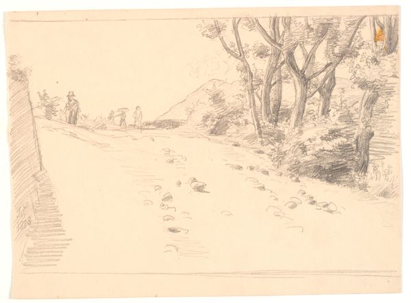 Johan Antonie de Jonge rendered this sketch of a path lined with trees using charcoal. As a material, charcoal is directly linked to the natural world, quite literally created through a process of burning wood. Observe how de Jonge uses smudging and hatching to create a sense of depth and atmosphere, while the loose and expressive strokes capture the texture of the foliage and the play of light. The choice of this readily available material speaks to a tradition of plein air drawing, reflecting the artist's immediate engagement with the landscape. It is interesting to note the ease of the drawing, but this belies the labor involved in charcoal production. By attending to the processes and material of the making, we can deepen our appreciation of this seemingly simple sketch, allowing us to see the natural world through the artist's perspective.