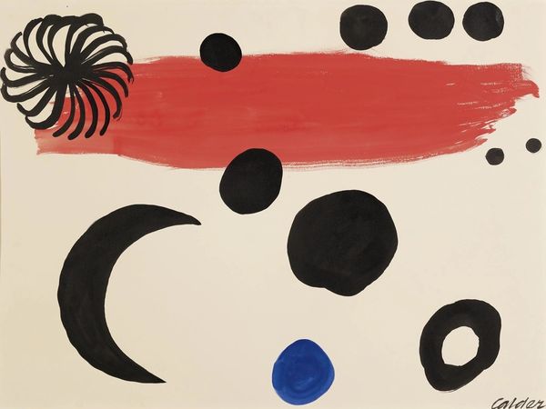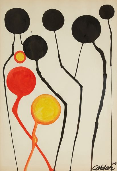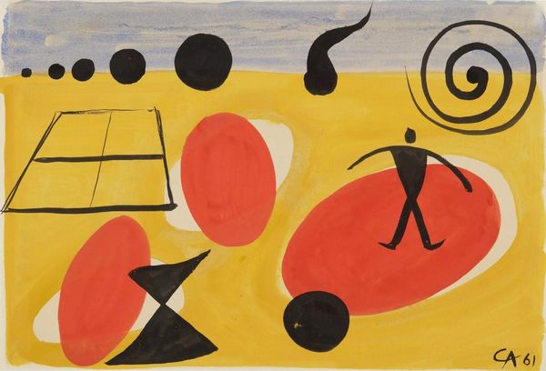 Curator: I find this a deceptively simple composition. When you first glance at Alexander Calder's "Composition," painted in 1953, what’s your initial reaction? Editor: Whimsical, yet somehow grounded. The basic shapes and colors create a playful energy, but the darker elements suggest a deeper, almost primal, force at play. Curator: Indeed. Calder’s work often gives that impression. What is remarkable to me is that through a vocabulary of very simple shapes like circles and lines he brings forward our human need for symbols and patterns to give meaning to chaos. The bright colours do add a lightness to what would otherwise be a very somber arrangement of shapes. Editor: I agree. Calder was operating in a postwar era, a period of significant upheaval. It’s intriguing how the geometric forms feel both very modern, in line with a progressive post-war sensibility, and perhaps echo ancient archetypes. Circles representing wholeness, lines suggesting movement and direction. Were those shapes perceived as more optimistic for his audience, moving away from overt representation toward pure form? Curator: Precisely. It's tempting to read cultural symbolism into such a basic vocabulary, but Calder was always adamant that his abstract forms did not signify any particular person, object or event. He intended viewers to experience the shapes purely as shapes, and to perceive movement and direction that might reflect the universe in its endless turning and rearranging. It asks a lot of the viewer. Editor: Yet it also speaks to a desire for simplicity and order after so much disruption. I find it really interesting to observe how artistic and institutional validation shifted from figuration toward abstraction. It reveals a complex push and pull of historical context shaping taste. Curator: Absolutely. The museum's display of Calder's work here positions him as part of that pivotal moment when pure form gained widespread public acclaim. His visual language may seem intuitive today, but in its time, it was a powerful act of redefinition. What it holds now, I believe, is the invitation to rediscover visual play, just form, motion and emotion working in balance. Editor: An exercise in symbolic simplicity for complex times. A compelling idea to carry forward, I think.