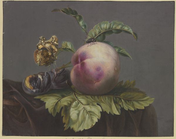 Curator: What strikes me immediately is the stark simplicity of the composition; the way Jan Brandes, likely between 1779 and 1788, organized these mundane objects on the page is almost mathematically elegant. Editor: Mundane is precisely what catches my attention, or, rather, how labor elevates the ordinary. These are the very fruits someone cultivated, harvested. We witness not just an image, but a snippet of lived agrarian reality, captured with watercolor, pen, and pencil. Curator: Consider the rendering of form; how Brandes employed watercolor to evoke volume. The chromatic values define shapes and generate pictorial depth through variations in shading and light; a study in realism but rendered with evident formalism. Editor: Formalism maybe obscures labor. Notice the drawing knife—its sleekness suggests use, craft. Think about the labor behind forging such tools; then reflect how Brandes, through his application, elevates his working life to art, using both fruits and artistic means available. Curator: Ah, but focusing exclusively on its materiality neglects its engagement with Dutch Golden Age still life. Look to the implied symbolism of the fruit; a classic emblem of earthly delights, rendered with muted tones and constrained composition. Editor: Well, and to make art, you need to consider more than paint and brushes: what was available to him, and who could afford these things. That very pencil suggests accessibility, everyday innovation. Curator: I am still fascinated by the calculated design. Notice how the linear precision of the knife offers a deliberate counterpoint to the organic forms. There is an order and intent beyond sheer utilitarian representation. Editor: Maybe. But Brandes uses what surrounds him – things of use – imbuing commonness with artful skill that hints to the artistic processes happening on and around him. This act has meaning far exceeding symbolic resonance. Curator: Perhaps both elements exist in conversation. He creates a meditation on the confluence of domestic life and artistic intent through shape and subject. Editor: Leaving us with thoughts regarding production of artistic endeavors versus the quotidian reality in a specific temporal-geographic reality.