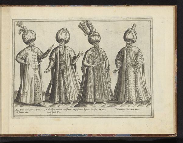 Editor: So, this engraving, "Four Eastern Men, Dressed According to the Fashion of around 1580," by Abraham de Bruyn, at the Rijksmuseum... It's fascinating how detailed their garments are. What symbols do you see in this image, and how do they tell a story? Curator: The symbolic language here speaks volumes about cultural understanding and, perhaps, misunderstanding. Consider the deer accompanying the figure on the left. What associations do we have with the deer as a symbol? Editor: Innocence, maybe? Something to be hunted? Curator: Exactly. And how might that perception play into the artist's representation of these "Eastern Men?" Then observe the objects each figure carries: a small hammer, pouches... These are all performative signifiers meant to signify specific cultural roles. The banners could be emblems of status and leadership within their community. What assumptions might viewers at the time have made based on these symbols alone? Editor: That they're exotic... maybe a bit dangerous? There's definitely an element of othering. Curator: Precisely. And by dissecting those assumptions, we can learn a great deal about the cultural lens through which these individuals were being viewed and the narrative the artist intended to convey through such choices. What do you make of the deer accompanying a man who wears a Turban, what emotional valence does that layering evoke for a contemporary audience? Editor: It feels like a commentary on cultural exchange and the potential for misinterpretation that has me thinking deeply about what cultural memory endures in these symbols and images. Curator: Absolutely. The image preserves a particular moment in history. These symbols trigger deeper thoughts about enduring cultural relations and the continuous reinterpretation of cultural symbolism throughout history.
