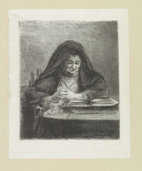 Jan Chalon created this etching, "Wijzende oude vrouw", sometime in the late 18th century. During this time, representing the elderly in art was often loaded with societal expectations and moral undertones. This image disrupts idealized notions of womanhood by portraying an older woman, perhaps a widow, with stark realism. Her pointed finger and intense gaze suggest a narrative of warning, or perhaps accusation. Consider the historical context: as the Enlightenment waned, there was a growing fascination with physiognomy, the belief that one could read character from facial features. Chalon's detailed rendering invites us to examine the woman's life, and how societal forces shaped her identity and perhaps left her marginalized. The emotional weight of this print resides in its contrast between the vulnerability of aging and the assertive gesture of her pointing hand, which prompts us to question our own biases and assumptions about aging, gender, and power.