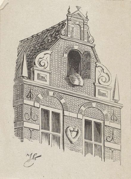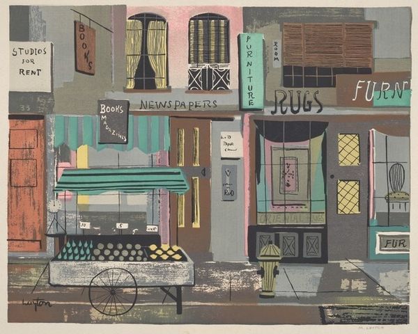 Curator: Sylvia Mayzer Rantz's print, "Pirate's Alley," presents an interesting glimpse into New Orleans architecture. Editor: It has a kind of whimsical, slightly haunted feel with the high contrast between the building and the sky. Curator: The wrought iron balconies speak to the city's complex social history, reflecting a blend of European elegance and colonial power structures. Editor: I'm intrigued by the geometry, particularly the way the artist uses repetition and simple shapes to create depth. Curator: Indeed, and how might the antique shop below symbolize the commodification of history itself, catering to tourists seeking a romanticized past? Editor: The printmaking technique, with its flat planes and bold outlines, emphasizes the graphic quality, giving it a modern edge. Curator: Perhaps it's a meditation on how places acquire meaning and how those meanings get contested and reshaped over time. Editor: Precisely, and it brings a fresh perspective to a place that's known to many.