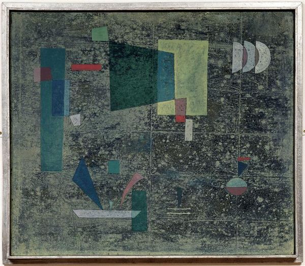 Curator: Immediately, I get this overwhelming sense of calm. It’s all these pastel colours on a teal background with simple shapes. Is it some sort of diagram? Editor: You know, that's a beautiful way to put it. We're looking at “De la Serie Cartas Celestes,” or "From the Celestial Letters Series," created by Lolo Soldevilla in 1956. Soldevilla was a pivotal figure in the Cuban concrete art movement, a group that shifted away from traditional representation to pure abstraction. Curator: Oh, concrete art, like those Bauhaus experiments? That makes sense! The shapes aren’t random then; they're deliberately basic, almost like minimalist building blocks. It still feels whimsical to me. Like staring at a blueprint of a playground dream. Editor: Precisely! Her work from this period reflected Cuba’s post-revolutionary moment of searching for new, utopian forms of social organization and expression. The lines connecting each shape almost read as constellations plotted onto a serene cosmic chart using watercolour on canvas. Curator: Celestial letters indeed! The lines shooting out of those circular orbs…it feels so connected, like everything is influencing everything else. Are the colours supposed to represent something, too? Or am I looking for meaning where there is none? Editor: While there isn't a codified color key, the use of simple geometric forms invites the viewer to consider the emotional and symbolic weight they carry within a socio-political context. How did geometric abstraction embody Cuba’s collective vision during that time? The answer to that isn't always apparent in this piece of art. Curator: Fascinating. To think these shapes contain all this hidden history… and the whole composition comes across like a secret language about freedom. Editor: Well said. Lolo's art during the Cuban Revolution demonstrates an act of visualizing freedom through non-objective imagery, thus leaving room for all sorts of conversations. Curator: Thank you for helping decode that with me, very illuminating! Editor: Always a pleasure to bring a broader understanding to the artistic practices behind art.