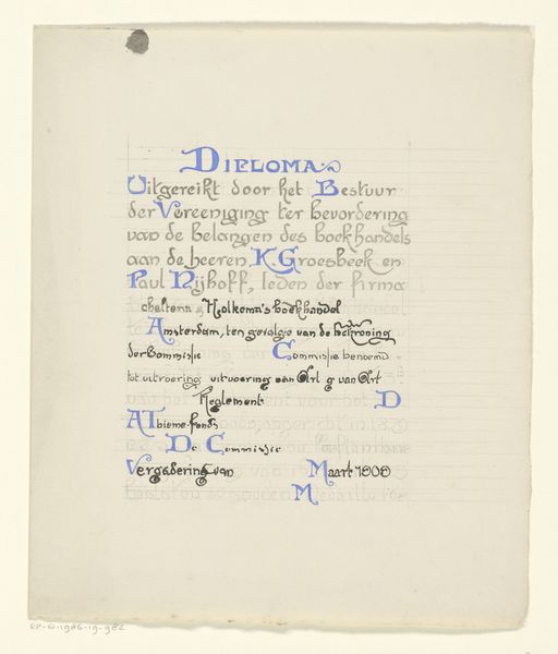 Editor: This is "Ontwerp voor een diploma van de Vereniging ter Bevordering van de Belangen des Boekhandels," or "Design for a Diploma of the Association for the Promotion of the Interests of Booksellers," created in 1909 by Reinier Willem Petrus de Vries. It's a drawing, a print really, using ink on paper and some typography. I’m struck by how sparse it is, especially the blank lines for, I guess, the recipient's name. What does this diploma design tell you? Curator: It’s a fascinating piece of graphic art. The Art Nouveau style clearly points to a specific moment in design history. More broadly, consider how such designs reflected a cultural need to professionalize various trades. Awarding a diploma wasn’t just a formality; it visually asserted standards and qualifications. How do you think this imagery reinforces the "interests of booksellers," as the title suggests? Editor: Well, I suppose the ornate script suggests a kind of learned respectability, linking bookselling with established traditions of scholarship and craftsmanship. Curator: Precisely! And what about the role of institutions like the "A.T. Thieme-fonds," mentioned at the bottom? To whom would they give a diploma, and why? Consider the commercial and social forces at play here. Editor: It seems it wouldn't be just anyone off the street! You’d need to prove some sort of competency or meet certain requirements set by the association, lending credibility to the bookseller. It connects commercial activity to validation and vetted quality. Curator: Exactly. Design isn't just aesthetic; it's deeply embedded in social and institutional power dynamics. The act of producing and distributing these certificates gave this organization power and the capacity to legitimize its members. Editor: It’s interesting to consider this diploma not just as a beautiful object but as a tool for establishing authority. Thanks! I’ll never look at a certificate the same way. Curator: Indeed! The study of graphic art can reveal how cultural values are literally "inscribed" into everyday objects.