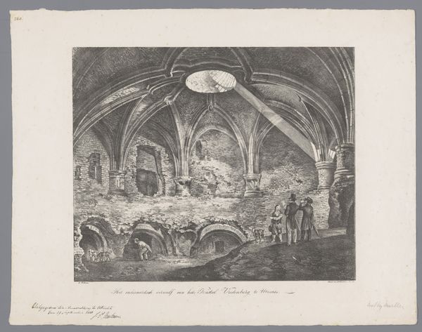 Friedrich Wilhelm Gmelin made this print, "View of the drainage channel of the lake near Albano," using etching, a printmaking technique. The method involves drawing a design with a needle onto a metal plate covered with wax, and then immersing the plate in acid. The acid bites into the metal where the wax has been removed, creating lines. These lines are then filled with ink, and the image is transferred to paper under high pressure. Notice how Gmelin's etching captures the texture and weight of the ancient stonework. The print conveys the immense labor involved in constructing such a massive structure. The regular, repeating shapes of the stones contrast with the organic forms of the tree, highlighting the tension between nature and human intervention. The figures in the print seem to be laboring, reminding us of the social context of such monumental projects. By focusing on the materials, the making, and the social context, Gmelin's etching challenges traditional distinctions between fine art and craft, inviting us to consider the value and meaning embedded in the processes of creation.