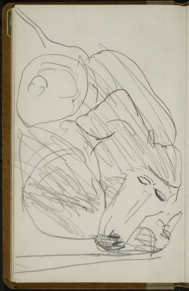 Editor: This is "Initial Sketch," from page 49 of a sketchbook by Max Beckmann. It appears to be a pencil drawing on paper. I find it very raw and immediate; you can almost feel the artist working out the form. What do you see in this piece, and how might we interpret it? Curator: I see a window into Beckmann's process, a glimpse behind the curtain of the polished, often enigmatic paintings he's known for. Beckmann, a German Expressionist, grappled with the trauma of World War I and the subsequent social and political upheavals. How does this quick sketch, with its almost hesitant lines, resonate with those tumultuous times? Editor: It's like he’s searching for something, a stable form perhaps, but not quite finding it. Is this uncertainty reflected in his other works from that period? Curator: Absolutely. This tentative quality reflects the broader societal anxieties. Consider how many artists of this era used fragmentation and distortion to convey a sense of disillusionment with established orders. The incompleteness, the very act of sketching, becomes a powerful commentary on the fractured nature of reality itself. What do you make of the figure’s obscured face? Editor: It feels almost like a deliberate erasure, hiding the individual’s identity. Almost as if they represent everyman. Curator: Precisely! In Expressionism, the individual is often symbolic of broader societal issues. Beckmann uses figuration, yet strips away specificity, highlighting a collective sense of unease and alienation. By leaving the face undefined, is Beckmann inviting viewers to project their own experiences and anxieties onto the subject? Editor: That's a fascinating idea, making it a mirror reflecting the viewer's own struggles. I now look at it in a completely different way. Curator: Art, especially from periods of conflict and change, allows us to interrogate our own positions within the social and historical landscape. Looking at Beckmann in the context of gender, race and politics really amplifies the questions and the work itself.