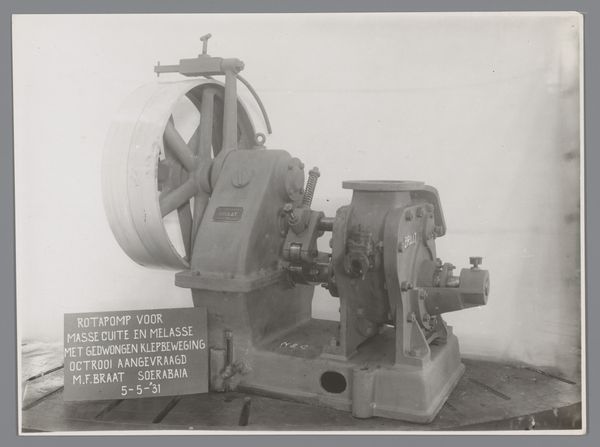 This photograph, Molen, in the Rijksmuseum, is by an anonymous artist using monochromatic film. I'm drawn to the anonymous nature of the artist; it focuses the mind on the subject of the image and the process of its creation. There's a clarity here that speaks to the function of the piece, but it also feels open and exploratory. The texture is palpable, you can almost feel the cool, smooth surface of the metal, and the heft of this large piece of machinery. I am intrigued by the sharp angles and lines, like a mechanical cubist painting, emphasizing the dimensionality and weight. The arrangement of shapes and tones create a balanced composition, drawing the eye around the image, and allowing for multiple points of focus. This reminds me of some of Bernd and Hilla Becher's photographs of industrial buildings, how they transform functional structures into objects of contemplation. Ultimately, it's the ambiguity of the artwork that's most appealing – its ability to be both representational and abstract, functional and aesthetic.