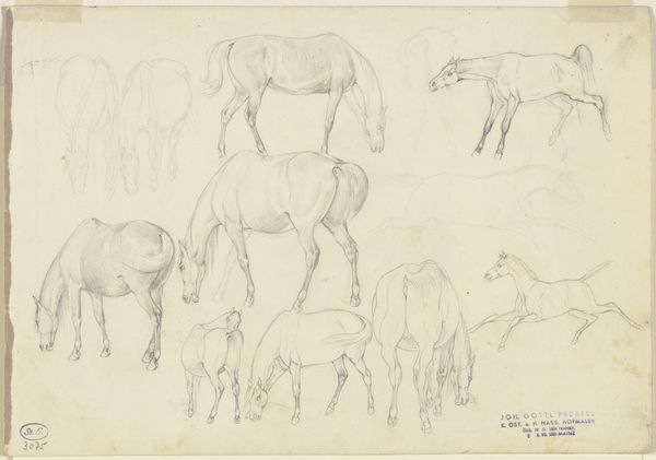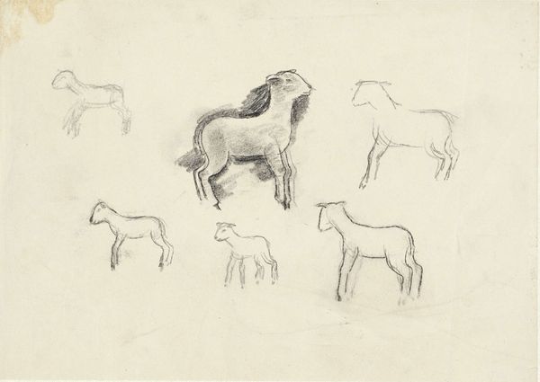 Editor: This is John Singer Sargent's "Studies of Cows," currently housed in the Harvard Art Museums. It is a simple sketch, a collection of cows drawn in pencil. It's the quickness of the lines that really strikes me. What do you notice about the composition? Curator: The artist's selection of line weight and density is particularly noteworthy. Observe how Sargent uses a lighter touch for the contour lines, defining the shapes, and a heavier hand to indicate shadow and volume. Editor: So the texture is what creates the depth? Curator: Precisely. Consider the formal relationships between the figures; note how the arrangement guides the viewer's eye. There's a rhythm established by the repetition and variation of forms. What does this visual tempo evoke for you? Editor: It makes the image feel lively and energized, despite the static subject. I see how much can be communicated through formal structure alone. Curator: Indeed, a focused examination of the elements of art yields a wealth of information.