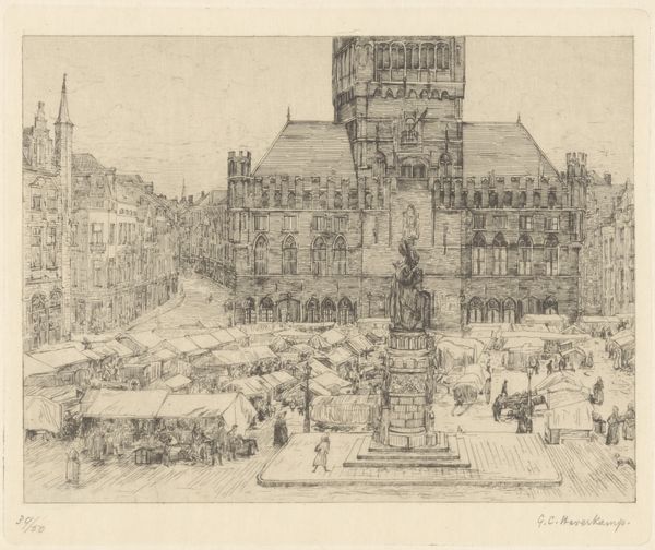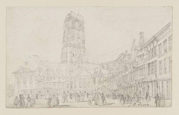 Editor: Samuel Prout's "Maline," created in 1833, depicts a European cityscape through drawing, lithograph, etching, and printmaking on paper. The overwhelming detail, the multitude of tiny lines, really grabs your attention. I'm curious about your perspective. What can you tell me about this piece? Curator: For me, it’s fascinating to consider the processes that produced this image. The combination of etching and lithography suggests a deliberate engagement with mass production and reproducibility. Think about it: How does the etching, with its linear precision, contrast with the lithographic areas, potentially allowing for broader tonal variations? Editor: I see what you mean about the contrasts! It’s also interesting how Prout combined these methods. Curator: Exactly! We also need to look at what that implies regarding the intended audience. Prints like this made cityscapes accessible. We need to think of these images not as unique objects, but items produced and distributed, bought and sold. What does the depiction of the urban environment communicate to the emerging middle class? Editor: That is a great point. Thinking about this piece in relation to accessibility, mass production and consumerism never occurred to me at first! It seemed like such a timeless scene. Curator: Timelessness is an illusion the artist is selling to this emerging market. Look closely, can you discern any indications in the work relating to labour? It seems idealized here. Editor: The activity of people seems, you're right, romanticized in a sense... it is not clear at all who produced this wealth or how society functions materially. This makes me wonder about the relationship of Prout to the places he drew. I mean, who could really afford this? Curator: Exactly, and from a materialist position it forces us to think beyond the simple beautiful image. These things really went hand in hand. It brings a new perspective to considering art history! Editor: This perspective really transformed the way I see this work. I'll certainly be examining other prints differently going forward.