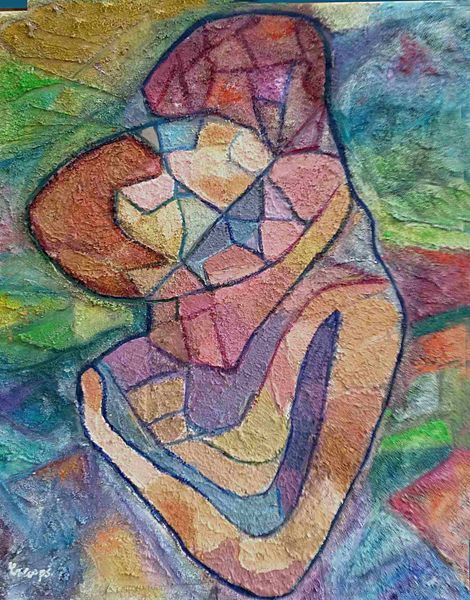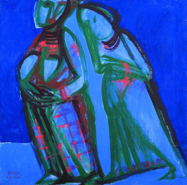 Editor: So, here we have an acrylic on canvas painting titled "Untitled" created by Georgi Kovachev in 1985. It definitely has this interesting tension between the vibrant Fauvist color palette and the somber scene depicted... almost a Fauvist icon? How do you interpret this work? Curator: Immediately, the pairing of figures reminds me of traditional iconography: a protector and someone being protected. But, rendered in acrylic with those swathes of color… the scene transforms. Do you see how the almost aggressive use of color changes our emotional perception? Editor: Yes, it feels less devotional and more…earthly? It's not quite a Madonna and Child. There’s almost something unsettling about the intensity of the colors and their slightly distorted forms. Curator: The visual symbols - a large figure reaching down, seemingly offering or taking something - they pull from something very old in our collective memory. But what? Is it comfort? A warning? The abstracted forms, painted with almost brutal honesty using color, feel almost… primal. Editor: That makes sense. It's like he's using familiar symbolic forms to evoke an emotional response, but through jarring, almost chaotic means. Do you think that was intentional? Curator: Absolutely! Think about what else was happening culturally in the mid-80s; a lot of uncertainty and anxiety. Kovachev uses recognizable visual cues - archetypes - but twists them, disrupting any simple reading. What looks at first like comfort transforms under a closer reading to reveal that the human figures in emotional contact are fragile and exposed, at risk of losing physical or mental balance. Editor: Wow, I wouldn't have seen so many layers without that deeper understanding of symbolism and cultural memory. It definitely gives the piece so much more depth. Curator: Exactly. Looking beyond the aesthetic is key to unlocking these complex stories woven within art.