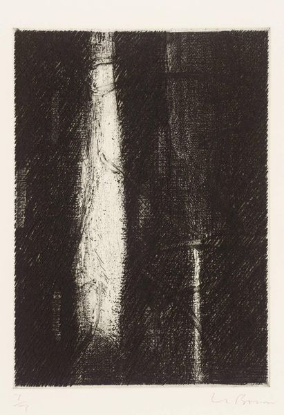 Jacobus Ludovicus Cornet created this etching titled "Traliehek" sometime in the 19th century. The image presents a barred gate or window, starkly rendered against an inky black background. This was a time of significant social and political change in the Netherlands, with debates around democracy, religion, and the role of the state. Cornet, who lived through much of this period, was also the director of the Royal Academy of Visual Arts of the Hague. It would be interesting to consider what role this played when observing this work. Is this darkness a commentary on the restrictive social and political climate, or is it a representation of a more personal, internal state? The choice of such a dark, constricting image could speak to the social structures of the time, or critique the institutions of art themselves. Further research, perhaps into Cornet’s involvement in social movements, or the critical reception of his work, could shed more light on this.