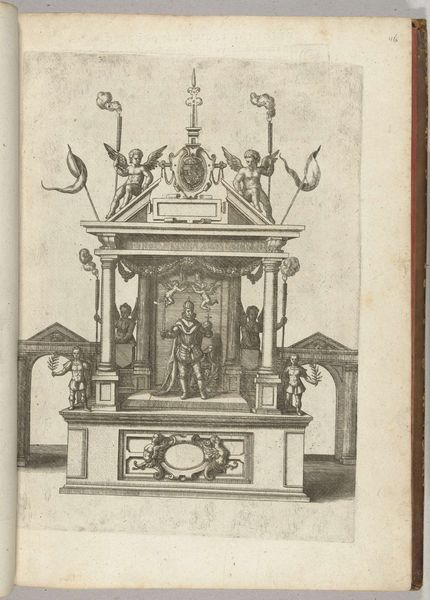 Curator: Let’s turn our attention to this album of views by Melchior Küsel, created after designs by Johann Wilhelm Baur, and others. Look at the details! Editor: Oh, it feels like stepping into a baroque dream. The cherubs, the fountain…a bit theatrical, isn't it? Curator: Yes! The cherubs are common symbols of love and innocence, framing the scene, drawing the eye upward. The fountain, likely a symbol of purification and life. Editor: So, a baptism of sorts? Cleansing and rebirth through art, maybe? The figures standing by the fountain, are they viewers or participants? Curator: That ambiguity is precisely what gives the piece its power. It invites us to project ourselves into the scene, to become part of this grand baroque vision. Editor: Right! It is as if the artist is beckoning us to join the spectacle. Makes me wonder, what spectacle awaits us on the other side? Curator: A world of symbols inviting us to contemplate life, love, and the artifice that surrounds them. Editor: I'll carry that in my mind today. What a lovely little trip.