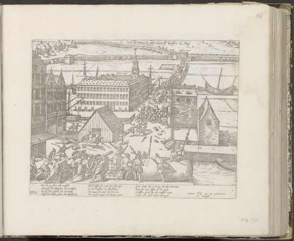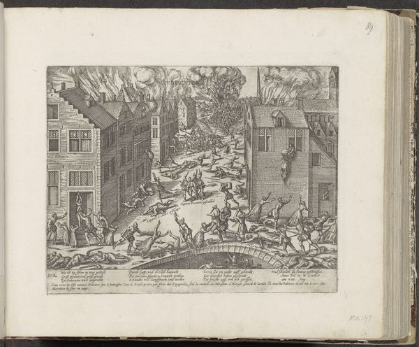 This engraving, made in 1592 depicts "Overval op Saint-Valery-sur-Somme" (Assault on Saint-Valery-sur-Somme). The image creates meaning through specific visual codes, cultural references, and historical associations tied to the religious conflicts in Europe at the time. Made in the Netherlands, during a period of intense struggle for independence from Spanish rule, the artwork reflects the social conditions of constant warfare and political instability. This piece likely served as a form of propaganda, portraying a specific event in a way that would influence public opinion and bolster support for the Dutch cause. The detailed depiction of the assault, with its chaotic scenes of violence, would have resonated strongly with a public living through similar experiences. As historians, we use resources like period documents, political pamphlets, and other visual materials to understand the full context of this work. Only then can we appreciate the complex interplay between art, society, and the institutions that shape them.
