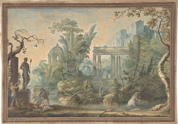 Jean Henri Alexandre Pernet created this watercolor and graphite drawing, Architectural Capriccio, sometime in the late 18th century. Pernet, who died at only 26 years old, situated his artistic practice within the grand tradition of French landscape painting. This drawing exemplifies the 18th-century artistic interest in the capriccio – an architectural fantasy. The scene blends real and imagined architectural elements, inviting us into a romantic, dreamlike space populated by figures in classical dress. But the dream is complicated by the ruins. The crumbling structures evoke a sense of nostalgia for a bygone era and perhaps even a melancholic commentary on the transient nature of human achievement. These ruins, while aesthetically pleasing, might also be seen as emblems of a society on the cusp of radical change. As viewers, we must ask ourselves: what does it mean to find beauty in decay, and how does this relate to the social and political realities of Pernet's time?