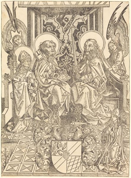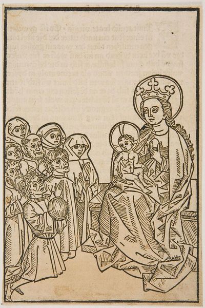 Curator: Ah, here we have "Pinksteren," or "Pentecost," created between 1490 and 1503 by the Master of the Delbecq Schreiber Passion. It is a woodcut print. Editor: My goodness, what a captivating scene! There’s almost a vibrating energy in the density of the lines. You can practically hear the hushed whispers, like a room buzzing with secrets. Curator: Indeed. The artist utilizes line masterfully. Notice how the dense, parallel strokes define the drapery and create a sense of volume, contrasting with the lighter areas that suggest illumination. This technique creates a dynamic interplay of light and shadow, which is central to the overall composition. Editor: Absolutely, and that dove, rendered with such simple strokes, feels so radiant and pure. But look at the faces! They're each so unique and expressive, though perhaps a little stiff. Are they supposed to be nervous or just... supremely focused? Curator: The faces, though stylized, serve to individualize the figures, alluding to their roles in the narrative. Observe the gazes; they converge towards a central point, emphasizing the Pentecostal descent. Also, the use of linear perspective, although somewhat rudimentary, creates spatial depth. Editor: There is something both familiar and wonderfully strange about the composition; everything is contained, neatly pressed, with almost zero negative space, a kind of visual feast, or like a choir squished into an elevator. Does the limited space give you any insights? Curator: The density and compression serve the thematic intent, signifying communal gathering and spiritual unity. Semiotically, the halos denote sanctity, while the book, often held, represents knowledge and scripture. Together, they convey the dissemination of divine wisdom during Pentecost. Editor: Makes sense! I suppose the books scattered around and their intensity denote knowledge being not only shared, but studied. Well, thanks for those historical nuggets, I do tend to get lost in the surface textures of these things... Curator: It is through this very attention to detail that the power of art lies; a potent reminder that engaging with an artwork through considered looking and analysis can unlock deep meaning and connection. Editor: Indeed. And sometimes, it’s simply nice to let yourself be absorbed by that initial, raw, visceral impact of witnessing, as if we have stepped into this small intense theatre performance, trapped with our dog-eared books and racing hearts, ready for... who knows what!