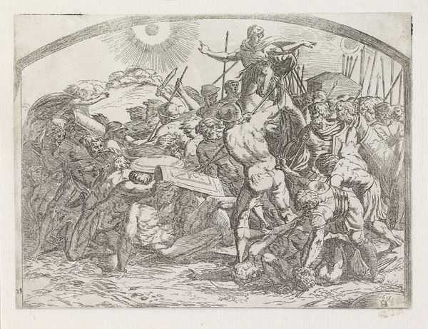 Curator: Before us we have Johannes Lingelbach's "Figures at a Quayside," believed to have been created sometime between 1647 and 1674. This drawing, executed with pen, charcoal and ink, provides a captivating snapshot of life at the harbor. Editor: It's immediately evocative, isn't it? I feel this slightly gritty atmosphere of dockside bustle—almost Dickensian in its feel, but bathed in a more serene, gray light. The activity level suggests that something significant is about to happen or has just concluded. Curator: Indeed. A thorough compositional analysis reveals a deliberate organization; the foreground is densely populated with resting figures and discarded implements. Further back, we see more formally posed figures amid the loading of pack animals and the looming verticals of ships masts or construction cranes. This stratified arrangement leads the eye methodically through the represented space, an example of astute planning. Editor: What strikes me most is how Lingelbach manages to convey so much story in what seems, at first glance, a relatively simple sketch. The figures aren’t idealized; they're real people engaged in honest work, with dirt on their clothes and exhaustion in their posture. There’s something about their world-worn essence that captivates me. It’s almost as if he's capturing moments, not types. Curator: Absolutely. A point could be made regarding Lingelbach’s incorporation of elements typically ascribed to genre-painting. Though subtly present, one must not ignore the stylistic nod toward Mannerism, with the slight distortions in scale of the men next to their animal companions or surrounding wares. Editor: The lack of vibrant color palette almost elevates the mundane nature of the scene. Lingelbach seems to challenge the need for grandiosity to elicit emotional connection from his audience. Each figure is presented through its gestural form. It gives off such a dream-like haze as the landscape is softly implied and fading in background. It allows our imagination to wander. Curator: An astute reflection! A primary aspect of Lingelbach’s composition remains rooted in structural precision. As we conclude, one appreciates Lingelbach’s skillful draftsmanship; here he renders an ordinary waterside scene into a fascinating snapshot. Editor: I can now envision Lingelbach, charcoal in hand, immersed in the everyday theater of the quayside and using art to reveal to us the poignant drama.