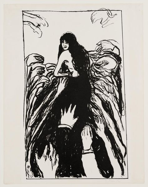 Editor: This is Edvard Munch's "The Hands" from 1895, a print made using ink and etching. It’s quite stark – mostly black ink – and evokes a really claustrophobic feeling with all those hands. What do you make of it? Curator: As a print, its method of production already implies a departure from the unique, authored art object towards something more reproducible and democratic. Consider the labour involved – the etching, the inking, each pull of the print contributing to its meaning. Are these hands, reaching towards the female figure, symbols of desire or exploitation? Perhaps they highlight the consumption of women’s bodies. Editor: That's interesting. I hadn't thought about it in terms of labour and exploitation. I was more focused on the emotional impact of the image itself. Do you think the material qualities of the print influence that emotional response? Curator: Absolutely. The stark contrast between the black ink and the white paper heightens the drama and anxiety. The lines are somewhat crude and quickly rendered. But consider the artist’s role, here as a skilled laborer using his skills to produce… this! Not so skilled when rendered in this way! Does the mode of production cheapen the emotion or enhance its raw nature? The ability to reproduce this feeling repeatedly, through the printing process, speaks volumes about its pervasiveness in society. Editor: So you’re saying the materials and process of creating the print contribute to our understanding of the themes Munch is exploring. Curator: Precisely. It moves beyond a purely aesthetic interpretation and demands we consider the social and economic context of both the artwork’s creation and its consumption. Editor: That makes a lot of sense. It definitely gives me a new way to think about prints and their place in art history. Curator: Indeed. Thinking about the material conditions and labor inherent in art production always enriches the conversation.