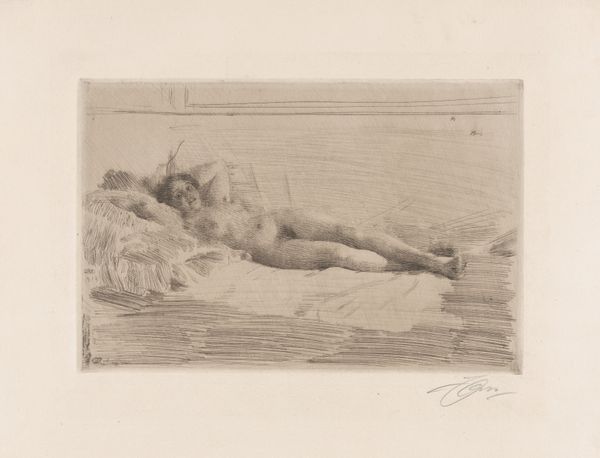 Curator: Lovis Corinth's "Reclining Female Nude," part of his "Seven Etchings" portfolio, offers an intimate glimpse into the artist's exploration of the human form. What’s your immediate take on this etching? Editor: It feels like a fleeting moment, a whisper of a form barely captured. The lines are so delicate, almost hesitant, yet they convey a real sensuality. Curator: The reclining nude is a recurring motif in art history, often symbolizing vulnerability or invitation. Corinth, though, seems to bypass idealization, focusing instead on raw, unadorned expression. Editor: Absolutely. She's not a goddess or an archetype; she's simply a woman, caught in a moment of private repose. There’s a raw honesty here. Curator: Corinth, born in 1858, certainly departs from academic tradition with his expressive linework and focus on emotional intensity. Editor: It makes you wonder about her story, her inner world. The looseness invites you to fill in the gaps, to project your own narrative. Curator: Indeed, its ambiguity makes it a compelling psychological study, inviting viewers to engage with their own perceptions of beauty and vulnerability. Editor: It’s a study in contrasts, this delicate rendering of a powerful and intimate subject. A tiny etching that speaks volumes.