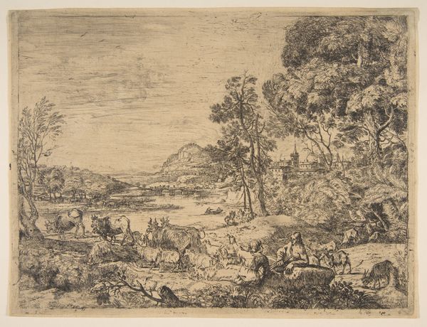 Curator: This landscape practically breathes, doesn’t it? The way the light just shimmers across the water. Editor: It does have an ethereal quality. We’re looking at "Landschaft mit bacchantischem Opferzug" or "Landscape with Bacchic Procession", attributed to Johannes Glauber, rendered with pen, ink, and wash on toned paper. Curator: A "Bacchic Procession"... instantly makes me think of wild revelry, bodies entwined, music swelling. But this, though alive with figures, feels…contained. Almost melancholy, perhaps? Editor: Melancholy might be spot on. Think about the historical context: Glauber, of Netherlandish origin, would have witnessed a society deeply entwined with religious and political conflict. The Bacchanal, often associated with freedom and excess, could represent a longing for a simpler, perhaps even idealized, pre-conflict world. Curator: Ah, a retreat to a mythical past! I see the figures processing – some carrying offerings, others leading animals…they're so delicately rendered, almost like ghosts moving through a dreamscape. The lines are so incredibly fine. What about the use of toned paper, technically speaking? Editor: The toned paper is crucial, providing a middle ground between the ink and the highlights, creating depth and atmospheric perspective with such subtle gradations. Curator: And the mountains in the distance! The overall effect is a balance between meticulous detail and dreamy vastness. A balance, maybe, mirroring that yearning you mentioned. This tension. Editor: Absolutely. The positioning of the bacchic group seems to point towards a collective dream for freedom as it reflects historical tension, not unlike dreams of justice pursued today. Curator: To stand here, almost centuries later, witnessing this imagined, yearning-filled scene...it makes you think about how little some human desires really change. Editor: It does ask what rituals of revelry mean amid oppression or simply difficult life circumstances; does their energy subvert or merely mask the problem? Something to think about.