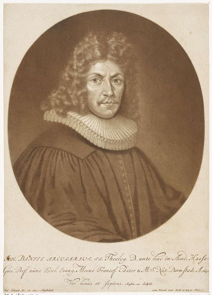 Curator: This is a portrait of Gerbrand van Leeuwen, a teacher and professor of Theology in Amsterdam, made sometime between 1670 and 1724 by Jacob Gole. The medium is engraving, and it’s part of the Rijksmuseum collection. Editor: It's a strikingly formal composition. The oval frame and limited tonal range give it a somewhat austere quality, almost like a carefully preserved document. The face of Gerbrand, however, is inviting, there's a strange quality of humanity in it. Curator: Exactly! Despite the constraints of the medium, there is so much captured in that gaze. The slight asymmetry in his expression conveys his role, which required him to be serious, while still empathetic to the lives and stories of those he taught. It captures a kind of personal humanity in the religious devotion it portrays. Editor: The curls cascading down hint at something other than pure austerity. A playful element offsets the severity of the plain collar and dark robe. See how those shapes interrupt the overall vertical emphasis? There’s visual interest generated just by this detail alone. Curator: Indeed, and that fashion, like all fashion, serves to denote cultural status, affiliation, even a certain personality, regardless of his role in the church. It subtly signals an awareness of earthly, cultural trends, grounding this theologian in the world, not above it. It underscores that theology is a practiced tradition rooted in lived reality, not detached abstraction. Editor: It is interesting how the artist uses the material properties of engraving. It does allow for sharp details, yet a remarkable subtlety in shading that defines volume. How Gole plays with dark and light is so appealing. Curator: Gole leverages those qualities wonderfully here. It speaks to the enduring power of images to carry, transmit and perhaps even subtly transform meaning. Editor: A fine piece of structured observation indeed!