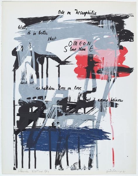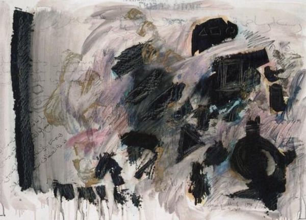 This untitled work is by Afro. It is a lithograph print which employs a range of black ink with muted tones and a few bright colours to create a dynamic and visually arresting image. The composition is built on a scaffolding of bold, assertive black shapes that dominate the visual space. The artist destabilizes conventional notions of representation, as these forms do not adhere to a singular interpretation. Instead, the non-mimetic shapes suggest a structural framework, not unlike the linguistic structures of semiotics. The touches of colour, such as the pastel pink, yellow and green, aren't merely decorative. They function almost as signifiers that add additional layers of complexity. The artist seems to invite us to consider how meaning is constructed, not just through the primary forms, but through the subtle interplay of colour, texture, and space. By challenging our perception, Afro encourages us to engage in a dialogue with the work that goes beyond the surface.