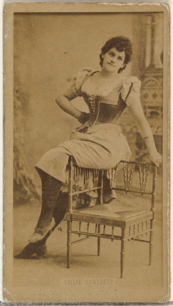 Editor: This is a print from Allen & Ginter dating from around 1885-1891, titled "Miss A. Boyd, from the Actors and Actresses series (N45, Type 8) for Virginia Brights Cigarettes." It looks like a sepia-toned photograph. She has a quirky pose, a mix of proper and... well, armed. What are your thoughts? Curator: It tickles me, actually! There's such a playfulness in the portrait, wouldn't you agree? She seems both elegant and like she’s about to leap into adventure – that hat, that little pistol! The cigarette card context gives it an interesting spin too. It's like they're saying smoking Virginia Brights gives you a bit of theatrical daring, hmm? Editor: A touch rebellious perhaps? And those sleeves are very puffy. Curator: Oh, absolutely! Notice, too, the composition. She is very much framed, boxed if you will, drawing all the more attention to *her* agency to resist the confines of propriety... but perhaps I'm seeing more than is there? Editor: No, that makes sense. There's a narrative tension. Do you think it was posed like that to shock or to generate an appetite for their brand? Curator: Well, certainly the aim was sales! But consider also the rise of women performers in the late 19th century and how these cards helped promote and normalize their visibility. What do you feel looking at this? What part of the actress’ attire draws your attention the most? Editor: Probably the juxtaposition of the very fancy sleeves with that old west looking hat. I hadn't considered the actress visibility factor either. I was caught up in thinking about cigarettes. Curator: See! Nuance! Next time you’re smoking a Virginia Brights, channel Miss A. Boyd and maybe the hat will appear in your mind’s eye! Editor: Haha, definitely a good thing to ponder. Thanks for the context!
