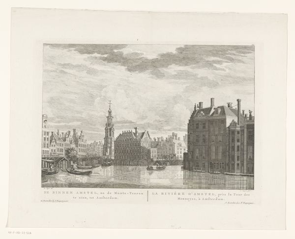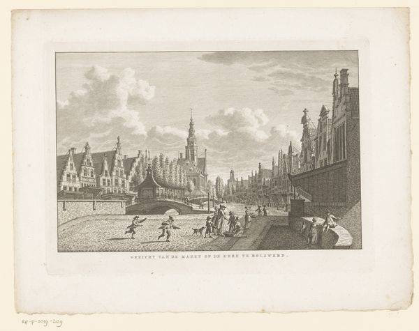 Editor: So, this is Hendrik Spilman’s “View of the Stenen or Brede Brug, the Beurs and the Gasthuiskerk in Zierikzee, 1745,” an etching dating roughly between 1754 and 1792. The detail is really striking! I’m curious about the kind of city that it depicts. What stands out to you? Curator: The scene evokes a strong sense of civic pride and prosperity. Canals were central to Dutch trade. Notice how the bridge, exchange (Beurs), and church are clustered. Do you sense the interplay between commerce, community, and spiritual life reflected in their arrangement? It reminds us that landscapes often encode complex power structures. Editor: I see what you mean, especially with the church being a focal point. But I’m wondering about the seemingly large clouds. Are they merely for balance or do they have other significance? Curator: Clouds often carry symbolic weight, acting as intermediaries between the earthly and divine realms. Consider the light they cast, shaping the mood and directing our gaze. The dense cloud might represent divine presence watching over this prosperous scene. What feeling do you get from this specific etching technique used? Editor: It gives it a documentary feel, almost like a precise record, yet still, it seems romanticized because everything looks so orderly. Is there something significant in how everyday life and architecture blend here? Curator: Precisely. Etchings such as this not only document the physical reality of a place, but also communicate a particular understanding of its identity and ideals, the Dutch Golden Age of prosperity and its legacy. Did our conversation make you think differently about it? Editor: Definitely. Seeing it as an articulation of civic pride rather than just a picturesque view gives it so much more depth. Thanks!