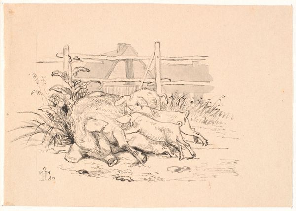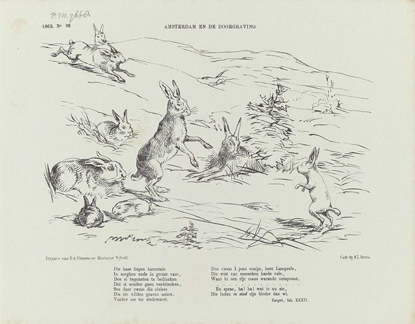 Curator: Here we have a political cartoon by Johan Michael Schmidt Crans, titled "Spotprent op de doortastende maatregelen van de Minister van Koloniën," dating back to 1863. The medium appears to be ink drawing and print. It depicts a rather chaotic scene… a swamp teeming with frogs and other creatures. Editor: Yes, immediately striking is the dynamism of the composition. The high contrast, the stark lines of the reeds, and the frantic activity of the frogs create a feeling of unrest and agitation. It’s almost a theatrical stage of anxiety rendered in black and white. Curator: Indeed. It's a caricature referencing colonial policy, you see the stork with a "Koloniën," or "Colonies" scroll strapped to it. The frogs represent different reactions to, likely, the firm measures taken by the Minister of Colonies. Editor: Note how the artist employs diagonal lines to drive the viewer’s eye across the scene, from the prone frog in the foreground—appearing utterly defeated—up to the dense gathering of the frog community further back. Semiotically, this downward slant communicates decline, or a falling apart. Curator: Precisely. Some frogs are clearly distressed, one even lying on its back. But look closer. Some frogs are armed, some seem to be giving orders. The cultural memory associated with frogs often places them as representatives of the common person. This print captures a society in upheaval. The poem beneath, from La Fontaine, suggests choosing the familiar even if unpleasant, over the dangers of a new regime. Editor: That stork figure looming large…it's presented in the sharpest focus of the composition. It stands in rigid contrast to the chaotic swamp creatures, suggesting a rigid hierarchical structure imposed on a formerly vibrant but unordered locale. The artist emphasizes the textural contrast: The smooth rendering of the scroll against the chaotic reed and rough skins. Curator: And let’s remember that in 1863, the Netherlands was still grappling with the ramifications of slavery in its colonies. This drawing taps into the anxieties of a populace grappling with reforms and their possible effects. These frogs may represent competing political voices and social anxieties, or perhaps different reactions toward the issue of Dutch colonial management during this tumultuous time. Editor: Seeing this artwork really emphasizes how graphic works use sharp structural contrasts and calculated imbalance to communicate disquiet. The material simplicity of ink emphasizes the powerful emotions through an economy of visual tools. Curator: Exactly. A reminder of how images encapsulate collective hopes and fears, retaining their emotional punch across centuries.