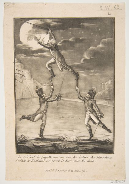 Editor: Here we have "The letter T standing on a pier holding a tree trunk," an 18th-century engraving by an anonymous artist. I find it quite bizarre—the figure forming the letter T is so strangely placed within this rather typical landscape and seascape scene. What’s your initial take? Curator: Bizarre is a good word! I'm immediately drawn to that juxtaposition, too. The figure seems caught between worlds – history painting colliding with landscape, maybe? It makes me think of those Renaissance allegories, where figures embody abstract concepts. Perhaps "T" represents a crossroads, a point of transition, heightened by the setting between land and sea? Editor: That makes sense, the transition element, given the pier. But is it meant to be comical? He doesn’t look particularly comfortable holding that trunk. Curator: Perhaps! Art in the 18th century could be witty. The discomfort adds another layer. The "T" figure is burdened. He embodies labor, and perhaps even, constraint. Is the beautiful landscape then mocking his effort, his burden, or complementing it? Editor: So the beauty of the cityscape almost highlights the difficulty, or the burden, of the figure’s pose? Curator: Precisely! Consider the ship in the distance - a symbol of freedom, exploration, trade - possibilities perhaps beyond the labourer’s grasp. It creates a tension between potential and reality, doesn't it? Almost melancholic, that he's holding a dead tree. Editor: It certainly reframes it from just being a strange image into something more nuanced. I now wonder if it's meant to be political. Curator: It absolutely could be. Art's beauty lies in its multi-layered interpretation. Something odd makes it beautiful and poetic! Editor: This was eye-opening! I initially saw absurdity; now, I perceive deeper reflections on labour, freedom, and social constraints. Curator: That's the magic, isn't it? Shifting perspectives unlock whole universes of meaning! It goes from silly to… strangely potent.