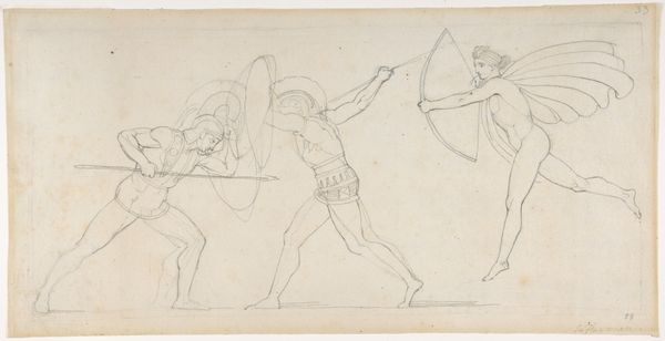 Curator: This delicate pencil drawing is entitled "Studie van man met ploeg," or "Study of Man with Plough" by Pieter Dupont, dating between 1880 and 1911. Editor: It feels ephemeral, almost as if the figures could fade away any second. The loose lines give it a dreamlike quality. Curator: Note how Dupont employs hatching and contour lines, albeit lightly, to suggest form and movement. The repetition of the figure creates a sense of layered activity. Semiotically, the plough suggests themes of labor and rural life. Editor: Absolutely. It’s fascinating how images of labor often play a critical role in reflecting a nation’s identity. One wonders what message Dupont intended to convey, given the shifting political and social landscape during that time. Agricultural work was rapidly evolving, becoming much more difficult with the introduction of industry, which I am sure influenced Dupont and other artists as the labor environment shifted. Curator: Indeed, we can see how the pencil marks contribute to its effect; they're not precise, but create the energy and texture. Editor: Beyond the pure visual impact, there’s an element of empathy in the way Dupont captures the essence of manual labor. It invites us to contemplate the historical narratives interwoven with daily life. Curator: The simplicity and reduction to just a figure also emphasize its essence, with form stripped down. Editor: Ultimately, Dupont’s study gives us more than just form. The work offers us the opportunity to remember laborers who went through strenuous physical trials in the hope of providing more sustenance for themselves and the burgeoning cities of Europe. Curator: Precisely. And when viewing artworks such as "Studie van man met ploeg," it's important to think of forms of simplicity like the ones shown today as equally important and powerful forms that artists experimented with for later, grander works.