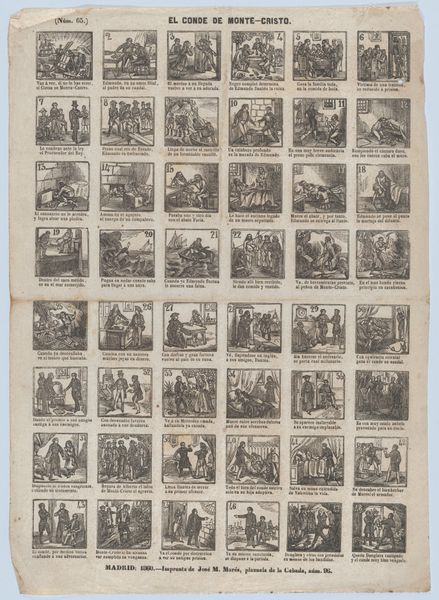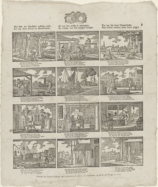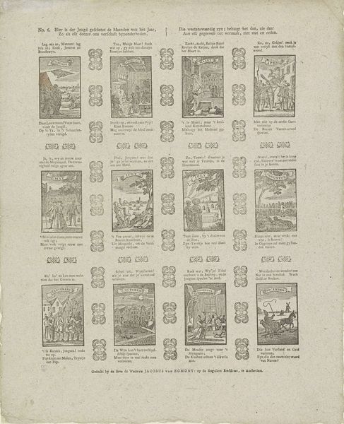 This print, 'T is om uw zinnen te vermaaken', was made by the heirs of widow Cornelis Stichter. It presents a grid of small, detailed scenes, each a window into different moments or narratives. The overall composition, structured by these individual squares, creates a sense of order, yet each scene bursts with activity. The stark contrast between light and shadow, achieved through the engraving technique, animates each little world. This contrast does more than illustrate; it signifies. The light illuminates actions, making the dark spaces equally crucial. The scenes vary, but they are unified by line and tone, creating a semiotic web of meaning. This print invites us to consider how form can delineate and question social narratives. By presenting life in fragmented yet interconnected scenes, the work destabilizes a singular viewpoint, inviting us to consider multiple perspectives.
