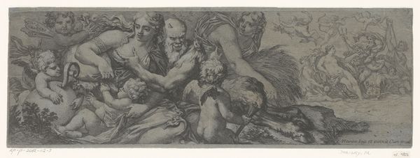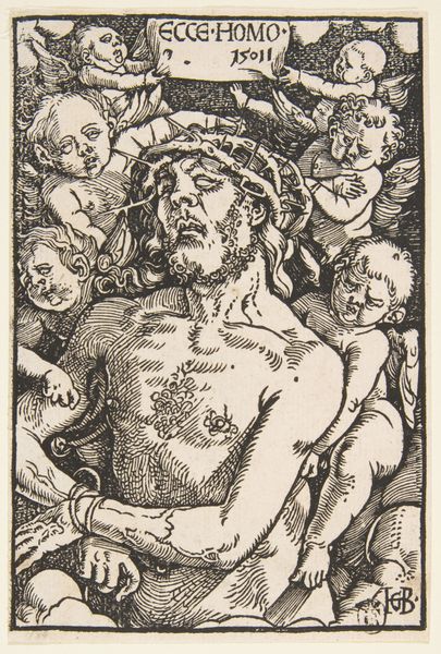 Daniel Hopfer created this iron etching of "The Sudarium Held by Two Angels" sometime in the late fifteenth or early sixteenth century. Hopfer was central in developing iron etching as an artistic medium, a technique which allowed for mass production and wider distribution of images, impacting the cultural and religious landscape of the time. The image depicts the face of Christ imprinted on the cloth of Saint Veronica, surrounded by cherubic figures. This representation of the Holy Face speaks to the intense religious devotion of the period. It also reflects the era’s complex relationship to relics and images, and the belief in their power to transmit divine grace. Consider how Hopfer, situated in a society grappling with religious reform and humanist thought, navigated the artistic representation of faith. What did it mean to produce and circulate images of the divine in this rapidly changing world? This work invites us to consider the intersection of faith, art, and the evolving cultural identity of the Renaissance.