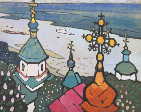 Curator: This acrylic painting by Yuriy Khymych, titled "The bell tower of the Far Caves", dates back to 1980. It offers a unique take on cityscape through the lens of post-impressionism. What are your initial thoughts? Editor: I'm struck by the boldness of it. The forms are simplified, almost childlike, yet there’s a sophistication in the color relationships, that vibrant green against the cooler blues and yellows of the architecture is wonderfully arresting. Curator: Indeed. The stylistic approach has leanings towards naive art, amplifying that sense of purity and immediate expression. But within that apparent simplicity lies a rich symbolism related to sacred architecture. Those domes, for instance, reference a spiritual ascent, don’t you think? The golden domes especially link the earthly and divine realms. Editor: Absolutely. Notice how the artist used the outlines to define forms. It accentuates flatness, almost as though he is prioritizing a symbolic language of form over perspectival accuracy. See how this contributes to a kind of flattening of meaning; the picture plane becoming a visual cipher, or emblem. Curator: Precisely! This architectural subject matter connects with Ukraine's history and Orthodox Christian heritage. Architectural motifs can represent communal memory and aspiration. Khymych paints not merely the buildings, but layers of historical consciousness. In these symbols, a visual vocabulary about spiritual endurance emerges. Editor: I appreciate the tensions he sets up compositionally, that is. the sharp contrasts, the clashing bright colors and bold lines which energize the piece but also contain a formal harmony of sorts. It is an intriguing combination of order and disorder, a tension that amplifies its visual impact. Curator: It speaks volumes of the role architecture has as witness. They are both aesthetic structures but serve also as silent bearers of a cultural ethos. Editor: I agree. It seems the lasting effect, for me, is how the artist transmutes architectural iconography into pure painterly sensation. Curator: It invites meditation on built history and also the artist’s visual heritage. Editor: For me, it demonstrates that art isn't about objective representations, but rather transforming shared cultural experience.