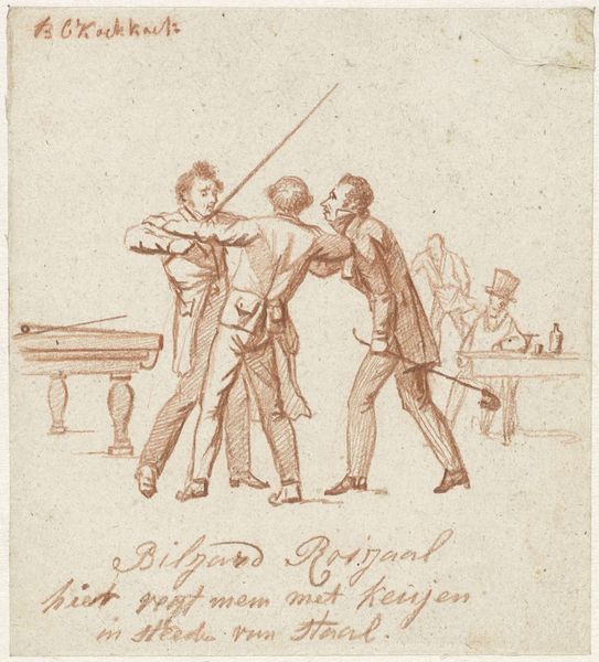 Pieter van Loon created this artwork, Duelling Men, using pen in brown, brush in gray and watercolour. The composition is dominated by two duellers in a landscape setting. The muted palette of greens, browns, and grays, applied with delicate washes of watercolour, conveys a sense of formality. The duellists face each other, swords extended, mirroring poses suggesting a balanced tension. The work's form embodies the theatricality of 19th-century duels, yet the lightness of the watercolor medium undermines the seriousness of the subject. The open space around the figures draws our attention to the formal aspects of gesture and pose. The work can be interpreted through the lens of social codes, challenging conventions through its understated approach. The act of duelling, laden with honour and status, becomes a spectacle when rendered in such delicate form, destabilizing its significance.