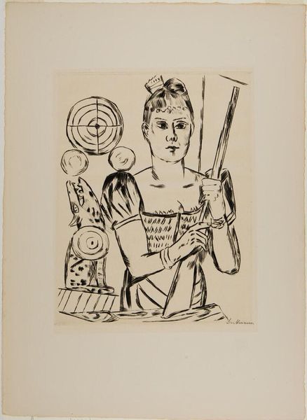 Curator: This is Max Beckmann’s "Snake Lady," held at the Harvard Art Museums. There’s no precise dating for this print. What’s your take on it? Editor: My first impression is unease. There’s a starkness to the linework that creates a palpable tension, almost like a scene from a play. Curator: Beckmann was deeply engaged with the social theater of his time. Consider the medium: printmaking allows for wider dissemination of imagery and ideas. It democratizes art, moving it beyond elite circles. Editor: Absolutely. The choice of a snake as a central motif is interesting, too. Snakes have complex symbolism—healing, danger, sexuality. Its presence could critique the social roles imposed on women. Curator: We also see a figure in the background, almost like a prisoner, reinforcing a sense of confinement and societal constraints. Beckmann experienced a world war. So, he clearly explores the psychological effects through his art. Editor: I agree. Examining the printmaking process itself—the labor, the materials, the means of reproduction—reveals so much about how Beckmann sought to engage with a fractured world. Curator: It's true, and understanding the historical context is key to decoding Beckmann's visual language. It’s a potent reminder of art's power to reflect and challenge society. Editor: Yes, thinking about how such images circulated in the early 20th century makes the work all the more compelling.