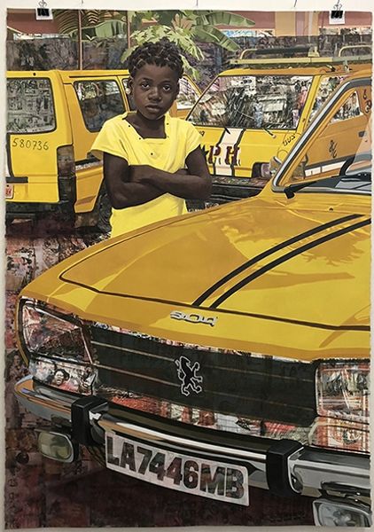 Curator: Joana Choumali's "Wonder Woman," currently held at the Harvard Art Museums, presents a striking image measuring over 110 inches in height. Editor: Wow, that's imposing. It feels a bit ghostly, almost like a memory fading into red threads. What's going on with the lower part? Curator: Choumali uses mixed media, combining photography and embroidery, which really challenges our understanding of labor and representation. The choice of a Wonder Woman t-shirt is also interesting. Editor: It's unexpected, that's for sure! It makes me wonder about the relationship between Western ideals and the person depicted. I almost feel a tension between strength and vulnerability. Curator: Precisely, and thinking about Choumali's Ivorian heritage, one might interpret the red threads as a reference to the body or even bloodlines. Editor: Now that you mention it, the image almost feels ancestral. It's really moving. Curator: It certainly encourages reflection on the nature of identity, doesn't it? Editor: Absolutely! It is as if identity is a construction.